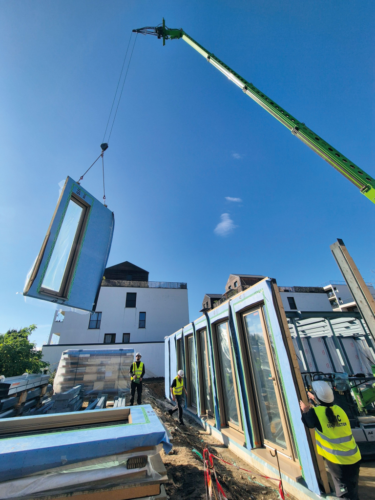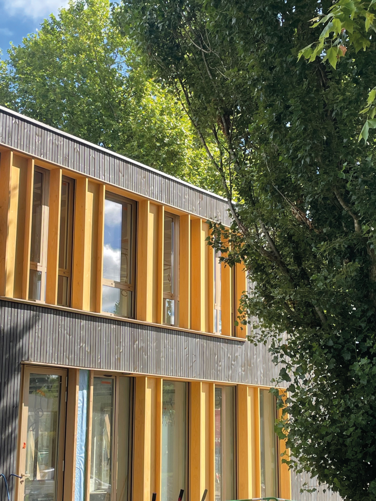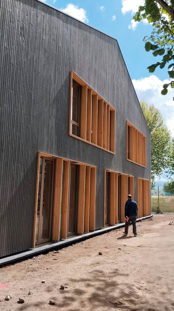 Chez Dassé, la préfabrication 2D intègre la structure, l’isolation, les menuiseries et les fermetures. Il est possible d’intégrer la finition extérieure, mais pour ce projet, le bardage est posé sur site afin d’éviter les joints visibles entre panneaux. Ce choix, voulu par les architectes, renforce la lecture architecturale de l’ensemble. « Nous avons travaillé la façade comme une composition, non comme une répétition. L’idée était que rien ne laisse deviner la préfabrication. Le bois, par ses teintes naturelles et ses encadrements couleur miel, donne aux bâtiments une identité douce et pérenne. » Pour le constructeur, cette opération, bien que complexe dans sa mise en œuvre, montre la maturité du hors site appliqué à la commande publique. « C’est un chantier exemplaire, labellisé Bâtiment Durable Nouvelle-Aquitaine, avec 100 % d’isolation biosourcée. En termes de performance, on atteint le niveau du traditionnel tout en réduisant les délais de 60 %. C’est un projet exigeant mais innovant, qui servira de référence. » De son côté, Vanessa Larrère explique que « construire hors site ne veut pas dire standardiser. Cela veut dire concevoir autrement, dès l’amont, avec des partenaires industriels impliqués et une conscience accrue des impacts environnementaux. »