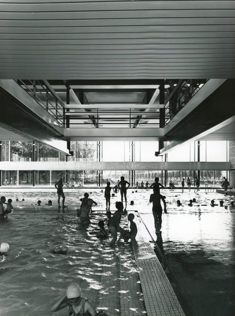 On peut le voir dans la piscine municipale de Château-Thierry (02), inaugurée en 1971. Elle résume bien leur approche. Loin des modèles types imposés aux communes à cette époque, Vaudou et Luthi imaginent une grande boîte de verre et de métal posée sur un radier de béton. La charpente métallique, dessinée avec soin, libère l’espace intérieur. Les façades vitrées ouvrent le bassin sur la ville et sur le ciel. À l’intérieur, la lumière circule librement, sans obstacle. Le pignon maçonné stabilise la structure tandis que les portiques en acier rythment le volume.