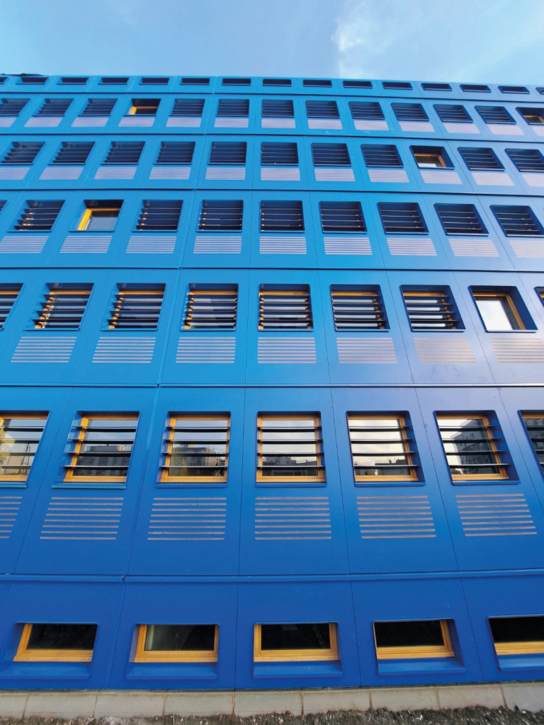 L’IUT Gratte-Ciel de Villeurbanne (69) a lancé un vaste programme de rénovation de son campus sur dix ans. Le bâtiment C est le premier à être entièrement transformé, et sa façade recouverte de panneaux bleus ne passe pas inaperçue. Maîtrise d’ouvrage et architecte ont osé la couleur, tout en réinterprétant l’existant à l’aide d’un procédé de façade en ossature bois hors site qui autorise une mise en œuvre rapide, limite les perturbations sur le campus et réduit l’empreinte carbone.