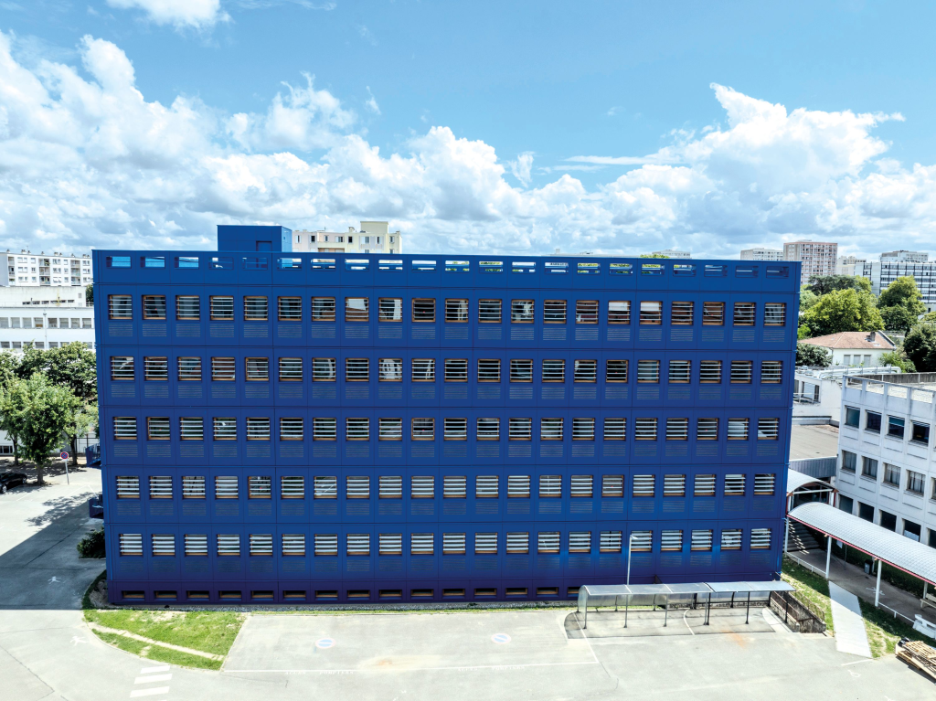 L’IUT Gratte-Ciel de Villeurbanne (69) a lancé un vaste programme de rénovation de son campus sur dix ans. Le bâtiment C est le premier à être entièrement transformé, et sa façade recouverte de panneaux bleus ne passe pas inaperçue. Maîtrise d’ouvrage et architecte ont osé la couleur, tout en réinterprétant l’existant à l’aide d’un procédé de façade en ossature bois hors site qui autorise une mise en œuvre rapide, limite les perturbations sur le campus et réduit l’empreinte carbone.