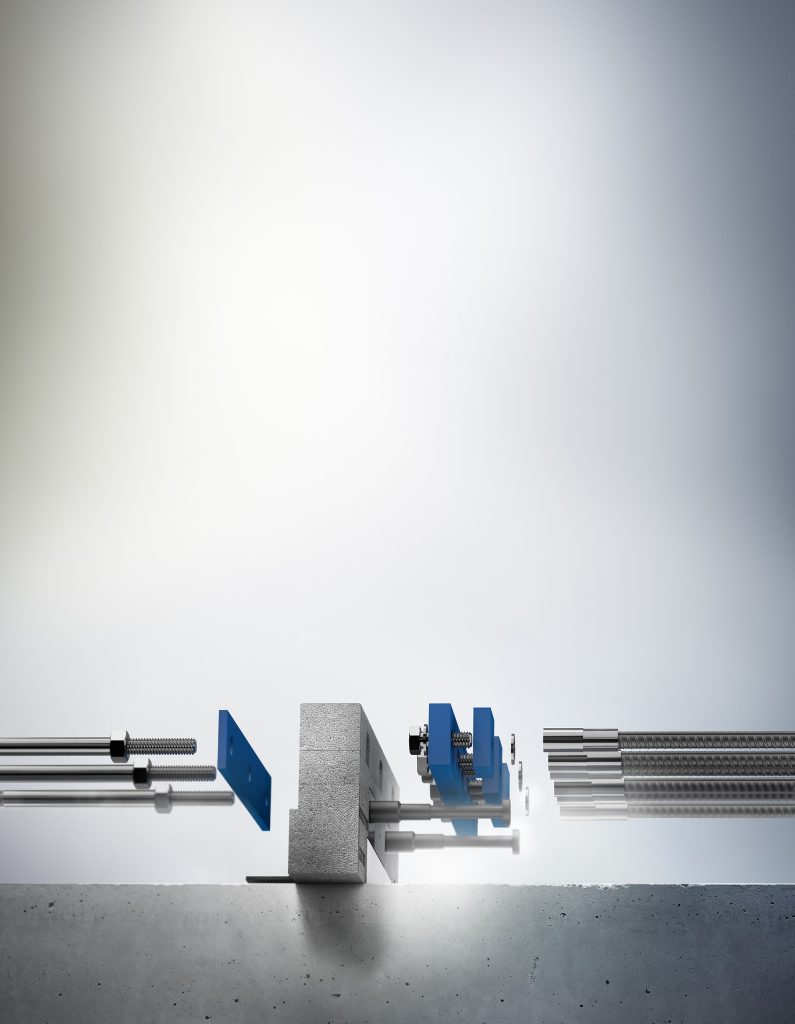 Afin de s’adapter à de nombreuses configurations de chantiers, le système se décline en deux variantes. Le type K-A comprend une plaque d’ancrage dans le plancher. Les tiges filetées du balcon sont fixées à une plaque de montage spécifique placée dans la dalle terminée. Les réservations sont ensuite refermées avec un mortier de scellement.
